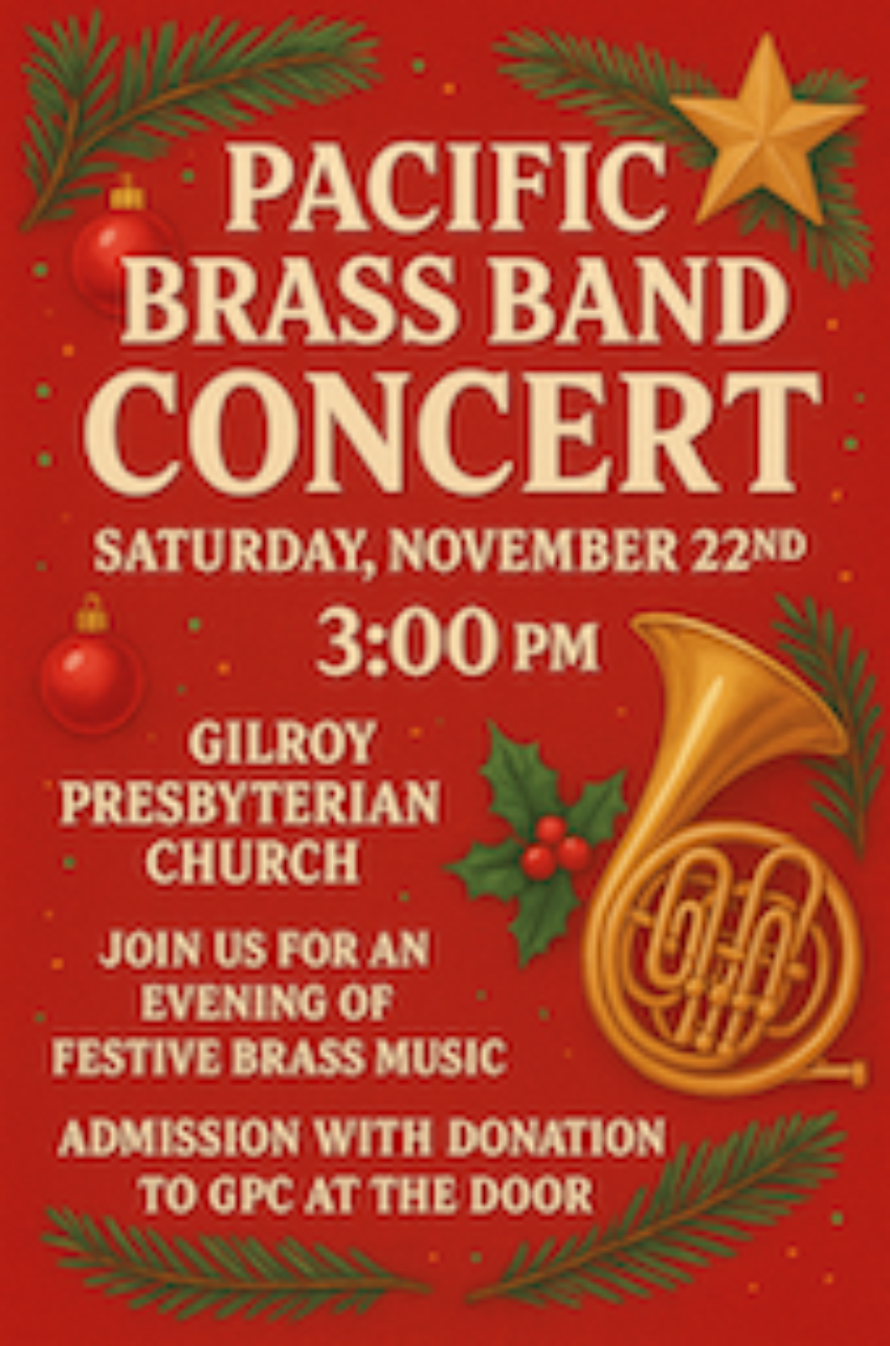 Join us on Saturday, November 22, 2025, at 3:00 pm for a holiday concert featuring The Pacific Brass Band.